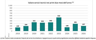 Il raffronto con il primo bimestre del 2025 invece non è così positivo, riportando un calo del 41,9%, un dato che è frutto del miglioramento dell’ultimo mese rispetto al disastroso mese di gennaio. Tuttavia, osservando il mercato da una prospettiva più ampia, anche sulla base dei dati raccolti nel periodo 2018-2024, continua a evidenziarsi un quadro che pare anticipare una tendenza nuovamente negativa. Infatti, confrontando il valore dei bandi del primo bimestre negli anni dal 2018 al 2026, quello dell’anno appena iniziato riporta uno tra i valori più bassi, intorno ai livelli del 2019. Fra le gare di maggiore rilievo per l’affidamento di servizi di ingegneria e architettura emergono quelle di Autostrade per l'Italia spa che pubblica un bando per la sorveglianza visiva dei siti di interesse geotecnico, strutture di sostegno e presidio roccioso della rete in gestione ad Autostrade per l'Italia per un valore di 13,3 mln e di Ire spa Infrastrutture Recupero Energia di Genova con un bando di progettazione per la realizzazione di un nuovo ospedale "Santa Corona" di Pietra Ligure. Le gare per tutti i servizi di ingegneria e architettura (esclusi gli appalti integrati) rilevate a febbraio sono state 143 e hanno raggiunto un importo di 106,3 mln, evidenziando un andamento del mercato solo apparentemente positivo. Infatti, a fronte di un’impennata su gennaio 2026 (+100,8%). Il primo bimestre dell’anno (con complessivi 159,3 mln) evidenzia un consistente calo del 41,9% sullo stesso periodo del 2025. Diversamente, per quanto riguarda le gare di sola progettazione, nel mese di febbraio il mercato evidenzia un andamento estremamente positivo, sia nel breve che nel lungo periodo, con un’impennata sul mese precedente (+230,9%). Il primo bimestre dell’anno (con 58,0 mln) evidenzia un +55,0% sullo stesso periodo dell’anno precedente.