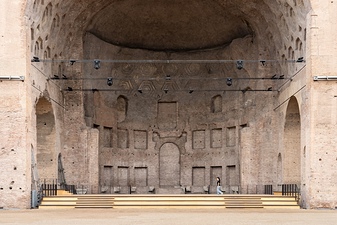 Dopo il restauro della navata centrale, l’opera dello studio Alvisi Kirimoto ruota attorno a tre elementi chiave: l’inserimento di una nuova struttura polifunzionale destinata a palco, il rifacimento della pavimentazione dell’intero complesso e l’installazione di 2 totem illustrativi. Il palco rappresenta il cuore del progetto, un’opera che trascende la semplice installazione per divenire un dispositivo culturale, che innesca un sistema di relazioni tra il monumento, i visitatori e gli eventi che qui prendono vita. Collocato nell’aula centrale, il palco ristabilisce la connessione trasversale tra le tre aule della navata, superando le strutture in acciaio che un tempo interrompevano il percorso. Molto più che una quinta architettonica, l’architettura ospiterà spettacoli teatrali, rassegne cinematografiche e conferenze, offrendo una prospettiva unica e suggestiva dei resti della Basilica. Inoltre, diventa un punto di osservazione privilegiato, da cui i visitatori possono ammirare i magnifici dettagli del monumento.