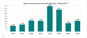 Nei primi undici mesi del 2025 si registra un incremento del valore dei bandi del 27,9% rispetto all’analogo periodo del 2024: circa 2,1 mld rispetto ai circa 1,6 dell’anno precedente. Va ricordato che il dato non comprende il maxi-bando Consip da 2,1 mld. che istituisce un sistema dinamico di acquisizione per 4 anni a beneficio delle stazioni appaltanti dal momento che non può essere equiparato alle altre tipologie di bandi di gara. Nell’undicesimo mese dell’anno, il valore ottenuto sommando l’importo delle gare per servizi di ingegneria e architettura (157,1 mln) al valore della progettazione esecutiva stimata compresa negli appalti integrati (25,9 mln), raggiunge l’importo complessivo di 183,0 mln, evidenziando un incremento del 16,3% su ottobre 2025, a fronte di una forte crescita del 70,8% su novembre 2024. Fra i bandi di maggiore importo si segnalano due accordi quadro: uno del Consorzio per le autostrade siciliane per le verifiche e ispezioni di sicurezza di ponti e viadotti di oltre 28,8 milioni e un altro di Anas per servizi tecnici finalizzati alla manutenzione di ponti e viadotti per un importo di 24 milioni. Le gare per soli servizi di ingegneria e architettura (esclusi gli appalti integrati) rilevate a novembre hanno raggiunto un importo di 157,1 mln, evidenziando un andamento estremamente positivo.