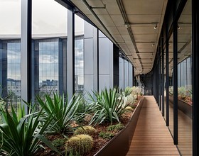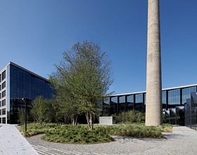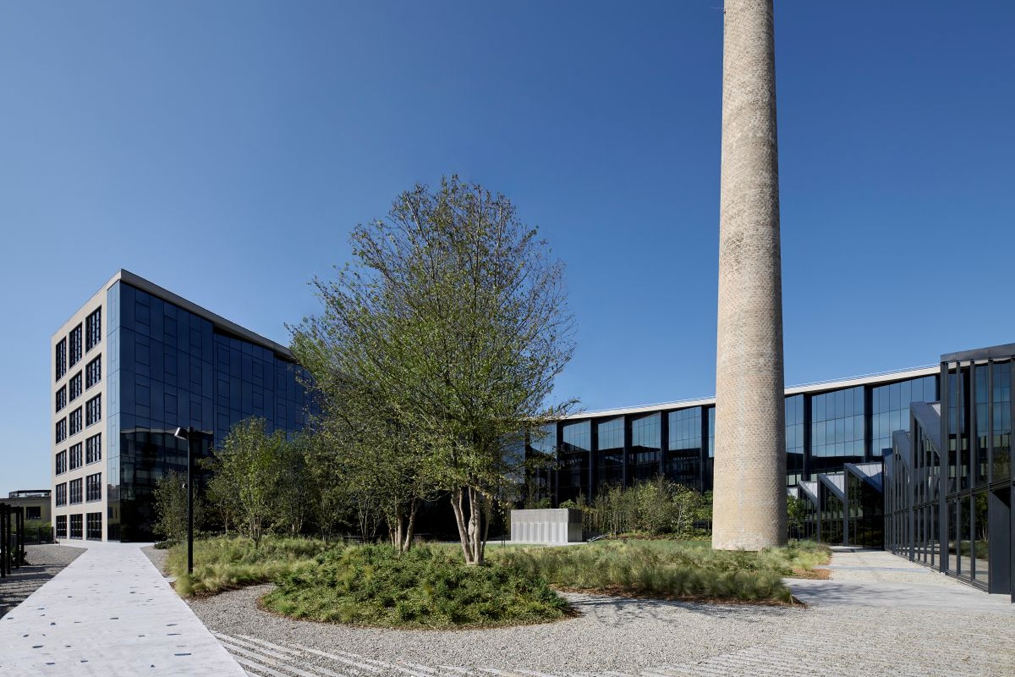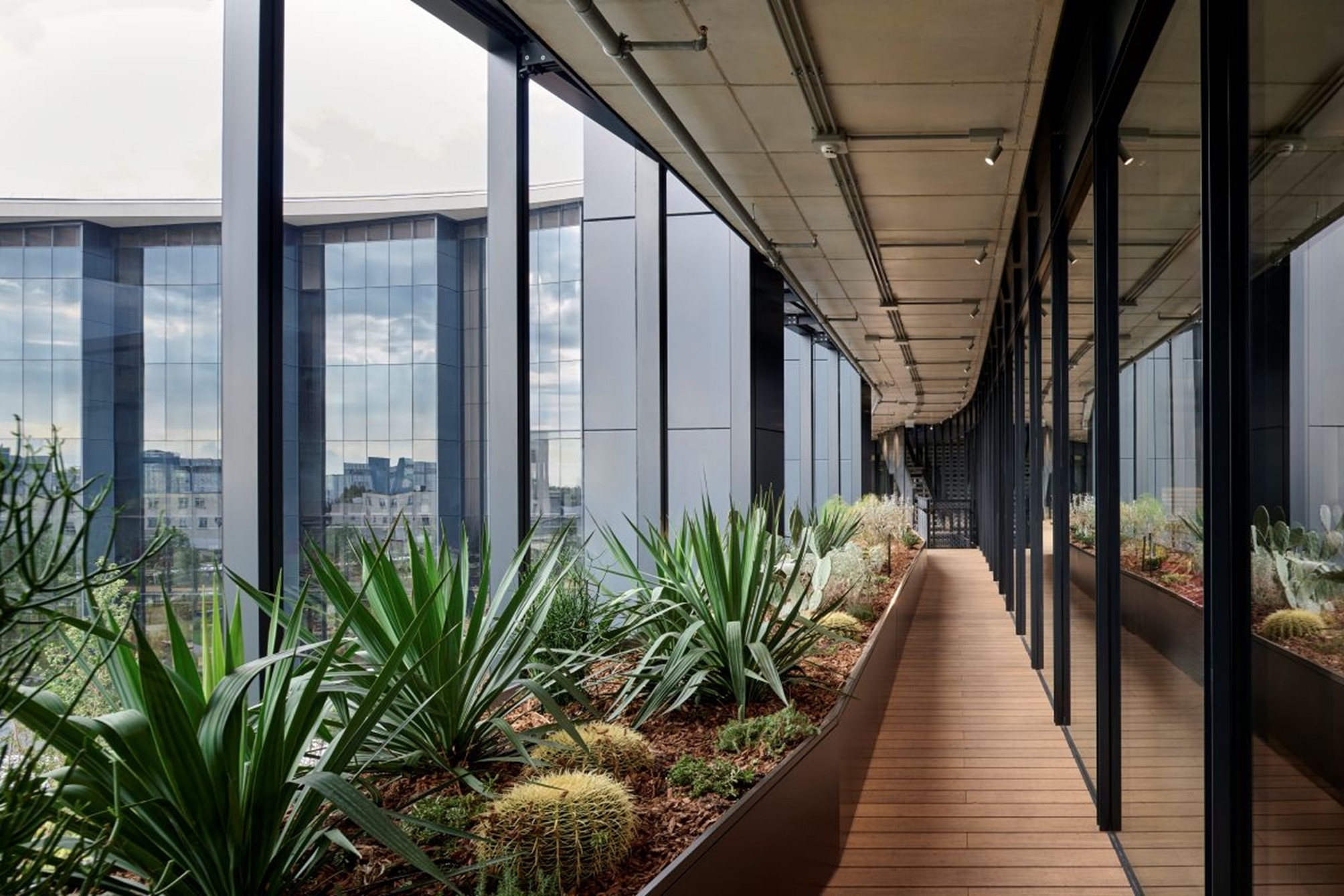 L’intervento si ispira al principio del Building-as-a-City e si distingue per il suo equilibrio tra innovazione sostenibile, comfort ambientale e linguaggio architettonico essenziale. Lo showroom è caratterizzato da una copertura a shed che valorizza la luce naturale e offre massima flessibilità espositiva. All’interno, una lobby a doppia altezza accoglie gli spazi comuni – caffetteria, ristorante aziendale, palestra e auditorium modulabile – favorendo il senso di comunità e l’incontro tra persone e idee. Il progetto riprende i materiali e le proporzioni tipiche della morfologia produttiva originaria. La ciminiera in mattoni, conservata come elemento di memoria, viene valorizzata come elemento del sistema di ventilazione passiva. Casa Moncler è anche un esperimento di architettura bioclimatica e design circolare: architettura e impiantistica operano in sinergia per massimizzare le prestazioni energetiche e garantire comfort. La ciminiera storica cattura l’aria esterna a 60 metri di altezza e la convoglia nella serra bioclimatica della facciata sud, che ospita tre ecosistemi – steppa, macchia mediterranea e deserto freddo – con specie vegetali scelte per la loro capacità di regolare naturalmente il microclima interno. Questo sistema naturale lavora in sinergia con impianti geotermici e fotovoltaici ad alta efficienza, contribuendo alla riduzione delle emissioni e al comfort termico degli ambienti. L’edificio è in corso di certificazione Leed e Well, riconoscimenti internazionali che attestano la qualità degli spazi e la sostenibilità complessiva del progetto. Casa Moncler si inserisce nel Symbiosis Community District, un masterplan di 125.000 mq firmato da Acpv Architects e sviluppato da Covivio, che ridefinisce il rapporto tra insediamenti produttivi, spazio pubblico e infrastrutture ambientali.
