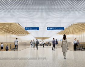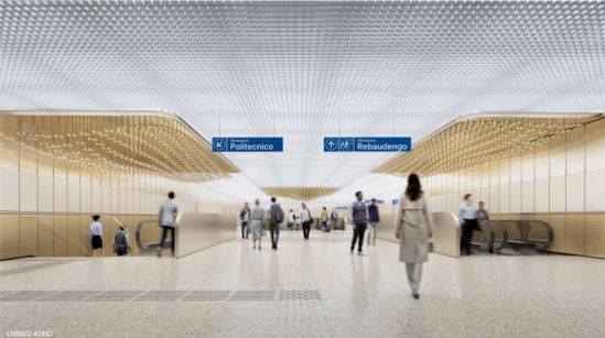 È il raggruppamento guidato da UNStudio – con Settanta7, Mijksenaar, Frigorosso, 3BA e WSP – a vincere il concorso internazionale di architettura. Il progetto presentato evidenzia un’attenta strategia nei confronti dell’ambiente urbano, capace di modulare le strutture attraverso forme di ispirazione naturale e di esaltare la leggerezza e la smaterializzazione del costruito. L’attenzione è posta sulla capacità del progetto di caratterizzare in modo chiaro e coerente l’intera linea, migliorando visibilità, accessibilità e leggibilità degli spazi, anche attraverso sistemi di orientamento efficaci, pensati per tutti gli utenti. Tornando alla struttura, le pensiline, che traggono ispirazione dai portici torinesi, elemento chiave e iconico del tessuto urbano storico della città, sono concepite come una struttura espandibile, capace di evolversi nel tempo per rispondere a nuove necessità e integrare servizi, creando una rete resiliente e in continua trasformazione. Proprio come i portici che creano percorsi protetti, riparati e familiari, le pensiline sono progettate per generare una sequenza ritmica di arcate, restituendo ai viaggiatori una percezione di continuità spaziale, sicurezza e comfort. Ogni struttura definisce un percorso chiaro e facilmente riconoscibile, richiamando la dimensione urbana e domestica dei passaggi coperti, integrandosi armoniosamente con l’architettura circostante e creando un dialogo coerente con la città e le sue caratteristiche storiche. L’identità della Stazione Urbana trasforma ogni stazione in un punto di riferimento riconoscibile e integrato nel quartiere, rafforzando il senso di orientamento e la connessione con la città. Il sistema di accesso al piano banchina definisce l’identità della stazione attraverso superfici, materiali, colori e pattern specifici, ispirati al contesto culturale circostante. Il contrasto tra l’esterno sobrio dei palazzi torinesi e la ricchezza degli interni diventa principio progettuale: dall’atrio verso le connessioni verticali, colori e geometrie più espressive introducono un orientamento indiretto e intuitivo.