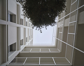 La casa è una manica a corpo doppio: la campata di 5 piani affacciata sulla via segue la sua giacitura, la campata interna di 7 piani segue le parcelle fondiarie. Il mancato allineamento è articolato dal corridoio comune di distribuzione, stretto tra le due campate. Con memoria della Tafuriana sprezzatura, la regolarità geometrica dei vani degli appartamenti è assicurata, confinando l’irregolarità nello spazio centrale
