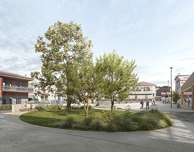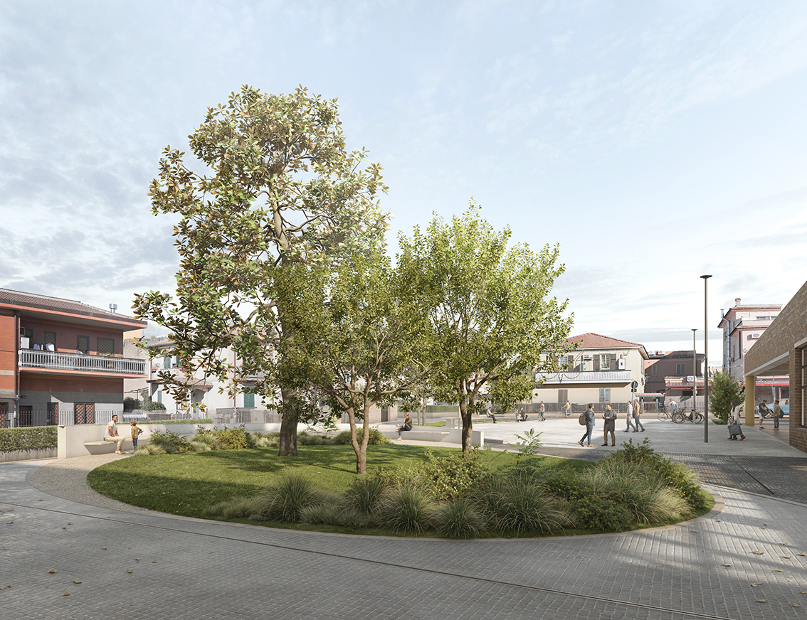 Il progetto, di conseguenza, definisce due gesti architettonici altrettanto semplici e potenti in grado didirezionare i flussi e creare due spazi distinti, ma complementari: la piazza Verde e la piazza Minerale. La prima, di 300 mq, dialoga con il restante verde pubblico costituito da aiuole alberate posizionate per donare ai cittadini aree di sosta ombreggiate e schermare la Piazza dalle strade vicine. La seconda con i suoi 460 mq, pavimentata e versatile, è un luogo dinamico e multifunzionale, delimitata da una lunga panca curvilinea.Una dualità non solo funzionale che riflette un equilibrio tra natura e urbanità, tra relax e vivacità.