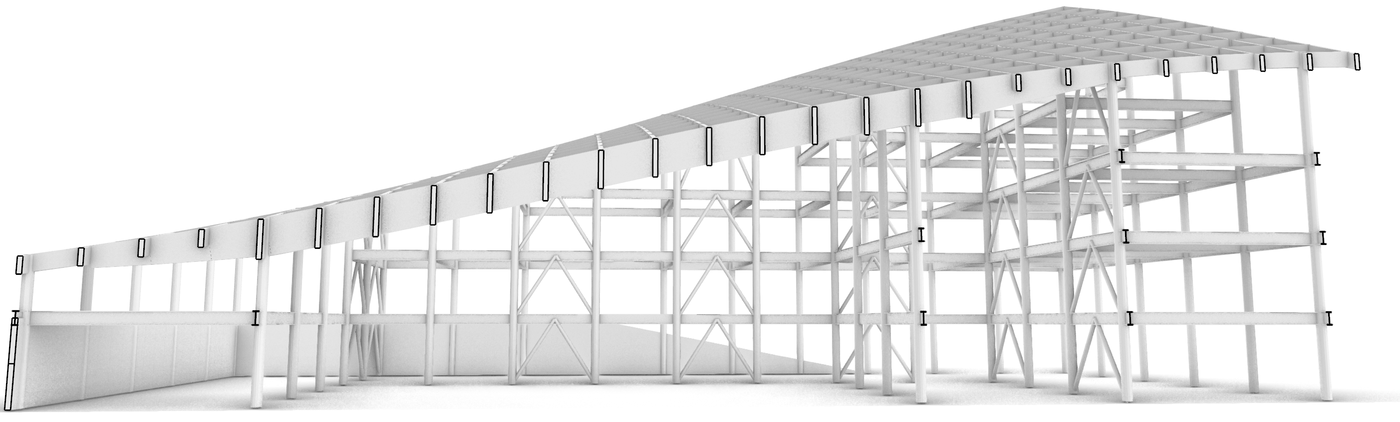 La struttura principale sarà costituita da colonne in acciaio tubolari cave CHS, orizzontamenti intermedi in struttura mista acciaio-legno completamente a secco, e struttura di copertura con una Diagrid a maglia quadrangolare in legno. La struttura di copertura sarà realizzata interamente in legno lamellare di classe adeguata alla classe di servizio necessaria tenendo opportunamente in conto l’esposizione ambientale e l’importanza dell’opera.