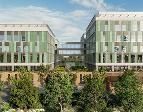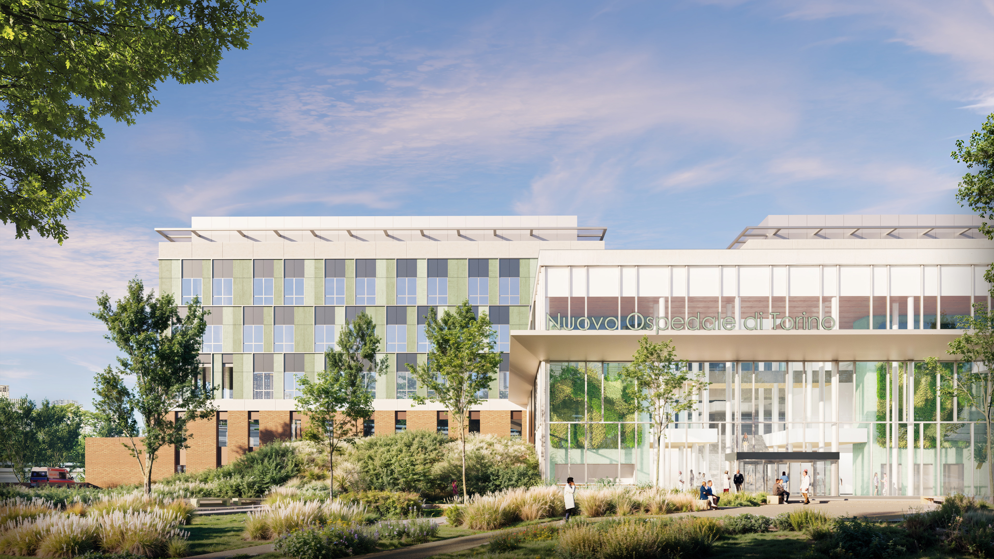 sale operatorie, 4 sale ibride, 13 sale diagnostiche, il pronto soccorso, il blocco operatorio e intervenistico, la sede del Dipartimento Materno-Infantile e spazi comuni, progettati per ottimizzare efficienza, comfort e fruibilità. All’esterno, l’architettura integra materiali tradizionali e contemporanei, armonizzandosi con il contesto urbano torinese: il basamento in laterizio faccia a vista richiama la tradizione locale, mentre i piani superiori, più leggeri e trasparenti, alternano pannelli in fibrocemento e facciate vetrate, ospitando le degenze in ambienti concepiti come spazi domestici con ampie aperture verso l’esterno. Il progetto è fortemente incentrato sulla sostenibilità, integrando soluzioni tecnologiche innovative ad alta efficienza energetica e a ridotto impatto ambientale. Al contempo, si configura come una ricucitura urbana, capace di armonizzare città, natura e spazi sanitari. Il progetto del nuovo complesso ospedaliero introduce una strategia paesaggistica integrata che valorizza la morfologia, l’ecologia e le funzioni del sito. Il verde è concepito come infrastruttura ambientale capace di mitigare l’impatto edilizio, gestire le acque in modo sostenibile e rafforzare le connessioni con il paesaggio urbano.