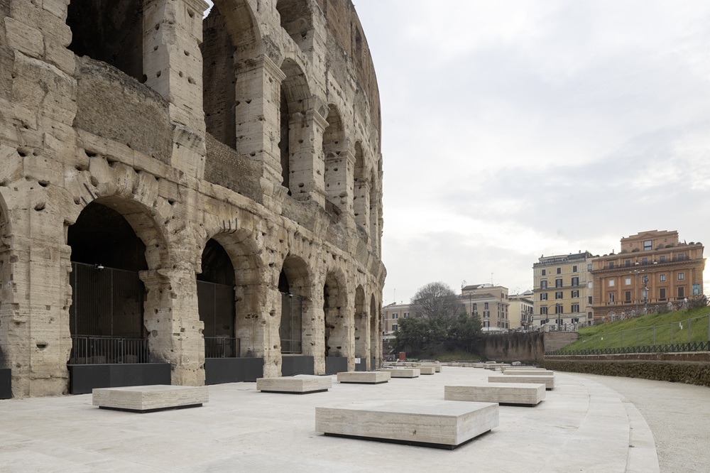 Il progetto di riqualificazione è stato curato dallo studio Stefano Boeri Interiors. I lavori hanno riguardato lo scavo e la pavimentazione in travertino, posata alla quota originaria della costruzione dell’Anfiteatro in età Flavia, al fine di distinguere nettamente il profilo del Colosseo con la sua crepidine dalla piazza moderna in sampietrini. La pavimentazione in travertino, dello stesso materiale di quella originaria, restituisce agli occhi dei visitatori il perimetro dei due ambulacri mancanti sul fronte meridionale dell’Anfiteatro. Della poderosa struttura pavimentale originaria del Colosseo si sono salvati dalle spoliazioni post antiche solo alcuni blocchi in travertino, rinvenuti grazie a questo scavo, che sono stati opportunamente mantenuti e recintati. Lo schema distributivo dei blocchi moderni è stato disegnato a partire da quello originario conservatosi grazie alle impronte lasciate dai blocchi antichi dopo la spoliazione e sull’esempio dei tratti ancora esistenti. In corrispondenza delle due file di pilastri che in antico sostenevano le volte della copertura dei due ambulacri, e nella stessa posizione e dimensione, seppur nella forma geometrica volutamente semplificata, sono stati collocati degli elementi, leggermente sollevati da terra per suggerire un volume perduto. Il lavoro fino a qui svolto è reversibile e realizzato con materiali innovativi come il massetto e l’adesivo specificamente formulati da Mapei per il Colosseo, nell’ambito di un accordo di sponsorizzazione tecnica con il Parco: un nuovo massetto e un adesivo, entrambi a base calce esenti da cemento e sali dannosi e compatibili dal punto di vista chimico-fisico e meccanico con i supporti e i materiali impiegati originariamente, pur nel rispetto dei requisiti previsti dalle normative attuali. Il progetto e il cantiere di lavoro si sono conclusi nel febbraio 2026. Il restauro delle superfici esposte e degli originali blocchi di travertino, oltre che la sistemazione dell’area archeologica degli ambulacri meridionali, aprono ora a cittadini e visitatori un settore del Colosseo finora non percepito come tale, permettendo l’uso pubblico di uno spazio rinnovato.