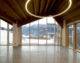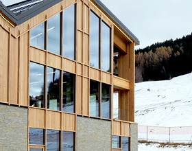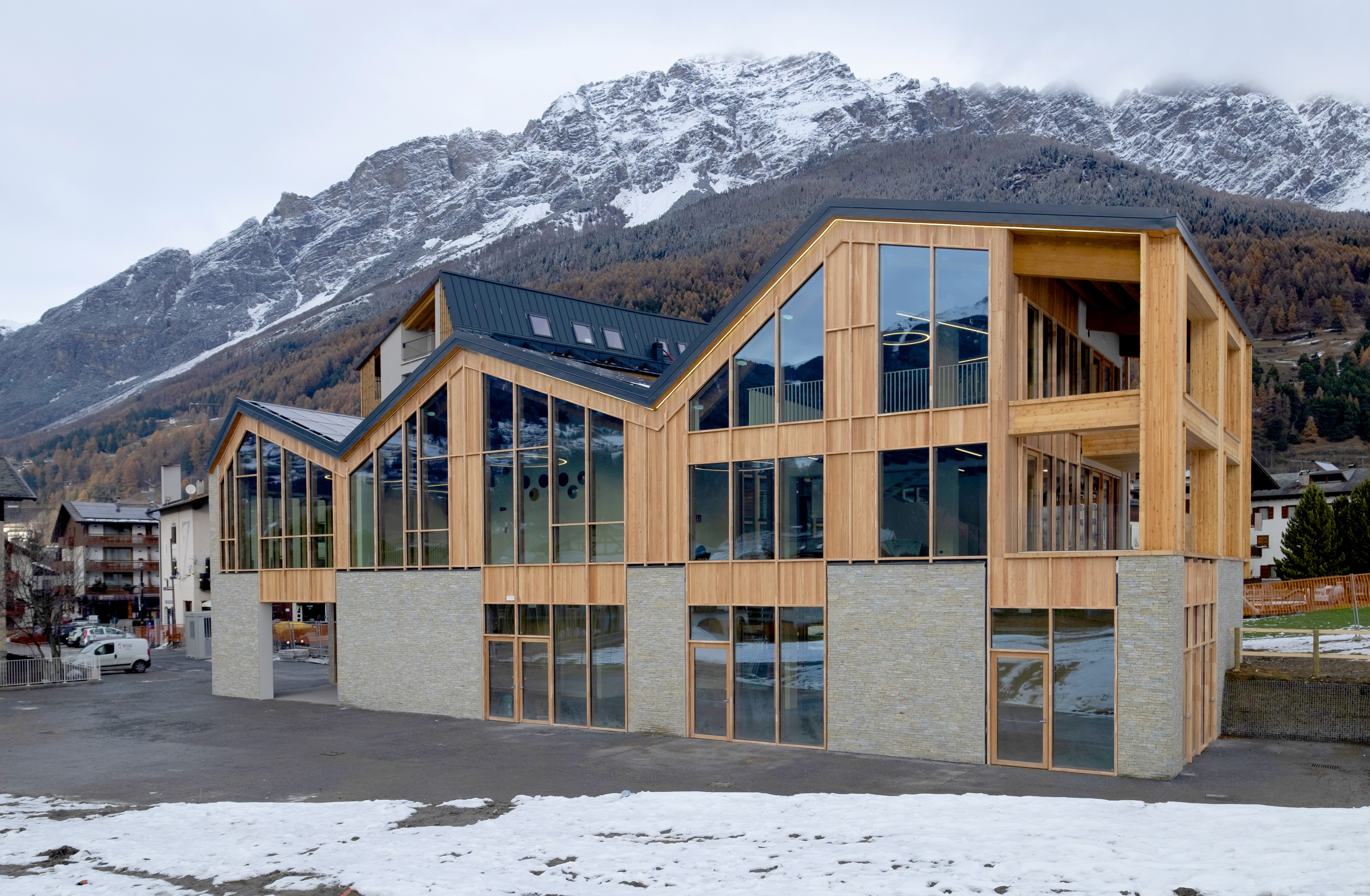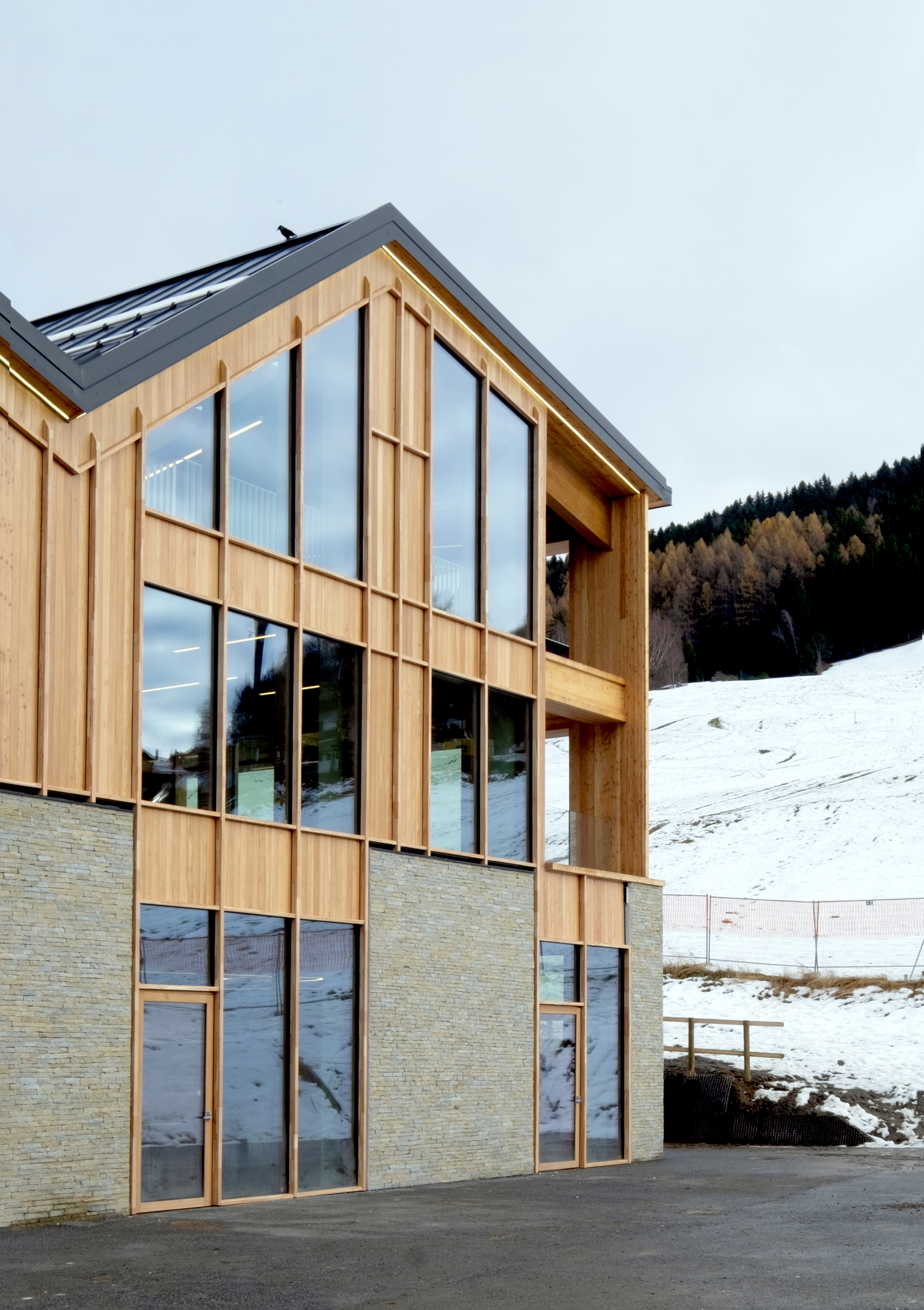 Caratterizzato da un tetto a falde che rievoca il paesaggio montano, l’Hospitality Lounge si sviluppa da una pianta rettangolare, su tre livelli. Il piano terra presenta in facciata la pietra locale facciavista, intervallata da porzioni vetrate a tutta altezza; il primo livello sul fronte sud lascia spazio ad una terrazza panoramica con vista sulla pista, che continua al piano secondo, pensato come un mezzanino. La copertura dell’edificio è composta da un sistema a 6 falde inclinate di differenti lunghezze, andando così a disegnare un profilo geometricamente articolato.