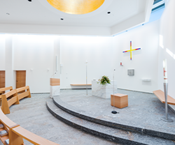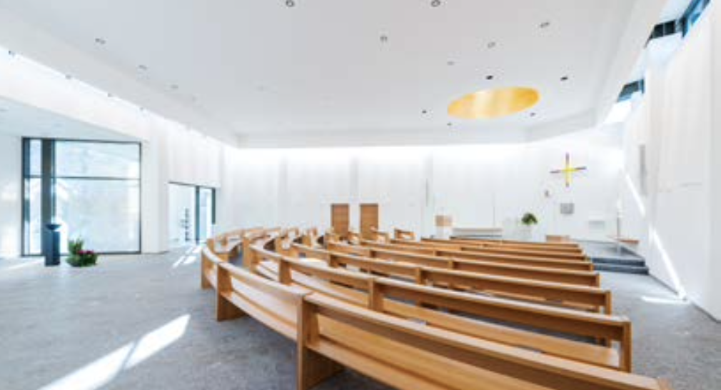 Le pareti e i soffitti del nuovo luogo di culto sono stati rivestiti con il sistema al silicato di Brillux, che oltre a soddisfare gli stringenti requisiti tecnici e acustici garantisce una resa estetica di pregio.