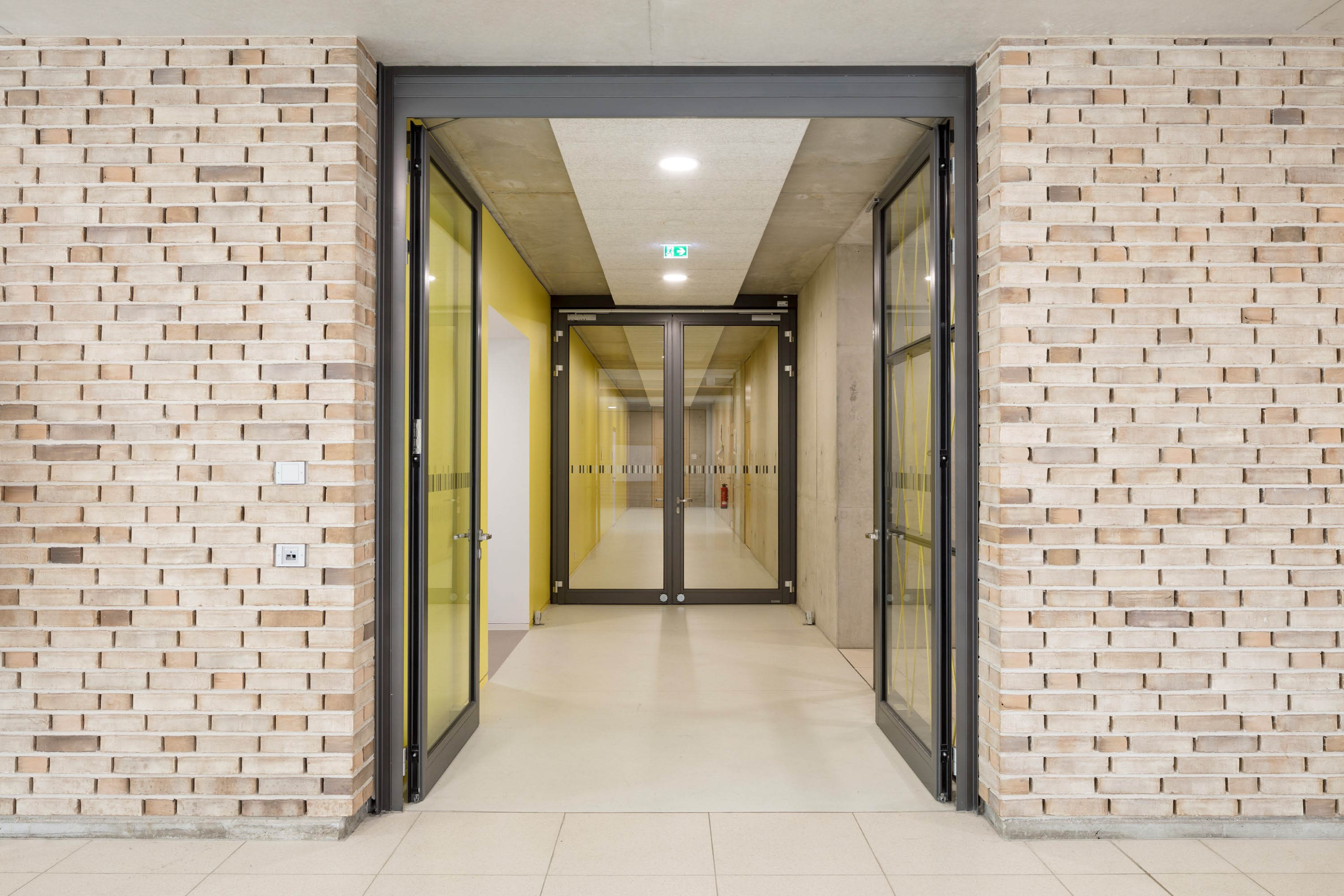 La disposizione degli ambienti e la scelta dei materiali rendono l'atmosfera accogliente e identitaria: ogni cluster è distinto da un colore di riferimento che facilita l’orientamento degli alunni più giovani. Questi spazi molto frequentati sono delimitati da porte Schörghuber- Gruppo Hörmanna prova di umidità, particolarmente robuste nonché concepite per soddisfare i requisiti di protezione dal fuoco, dal fumo e dal rumore.
