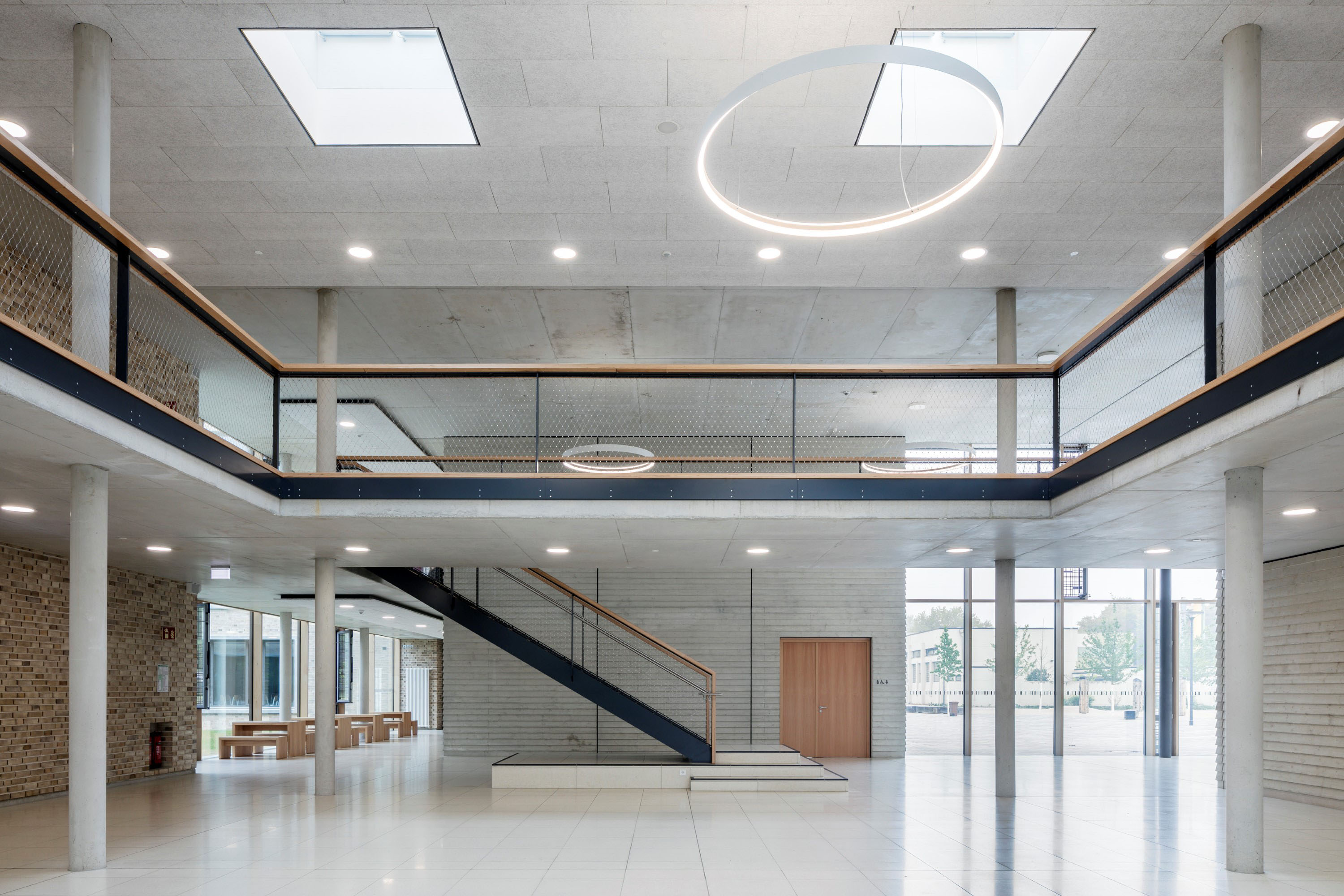 Sul lato opposto al connettivo principale, si trova invece il volume destinato ai laboratori per le materie scientifiche (dove sono state utilizzate soprattutto le porte antincendio e tagliafumo T30 Schörghuber- Gruppo Hörmann, a causa del maggiore rischio di incendio) e artistiche nonchè per i lavori manuali. Sul lato destro rispetto all‘atrio, si sviluppa poi il corpo di fabbrica che accoglie i servizi collettivi. Al primo piano si trovano la cucina, l‘area di distribuzione dei pasti e la mensa. Questi spazi sono rivestiti con doghe di faggio perfettamente integrate nelle pareti. La porta scorrevole in truciolo grezzo Schörghuber - Gruppo Hörmann conduce dalla mensa alla distribuzione pasti: è disposta in modo da impedire che gli odori provenienti dalla cucina si diffondano negli altri spazi, frequentati da circa 1.000 alunni. Al secondo piano, si trova inoltre la mediateca – un vero e proprio gioiello per la sua particolare atmosfera silenziosa – caratterizzata da una parete in vetro insonorizzato che si affaccia sulla mensa.