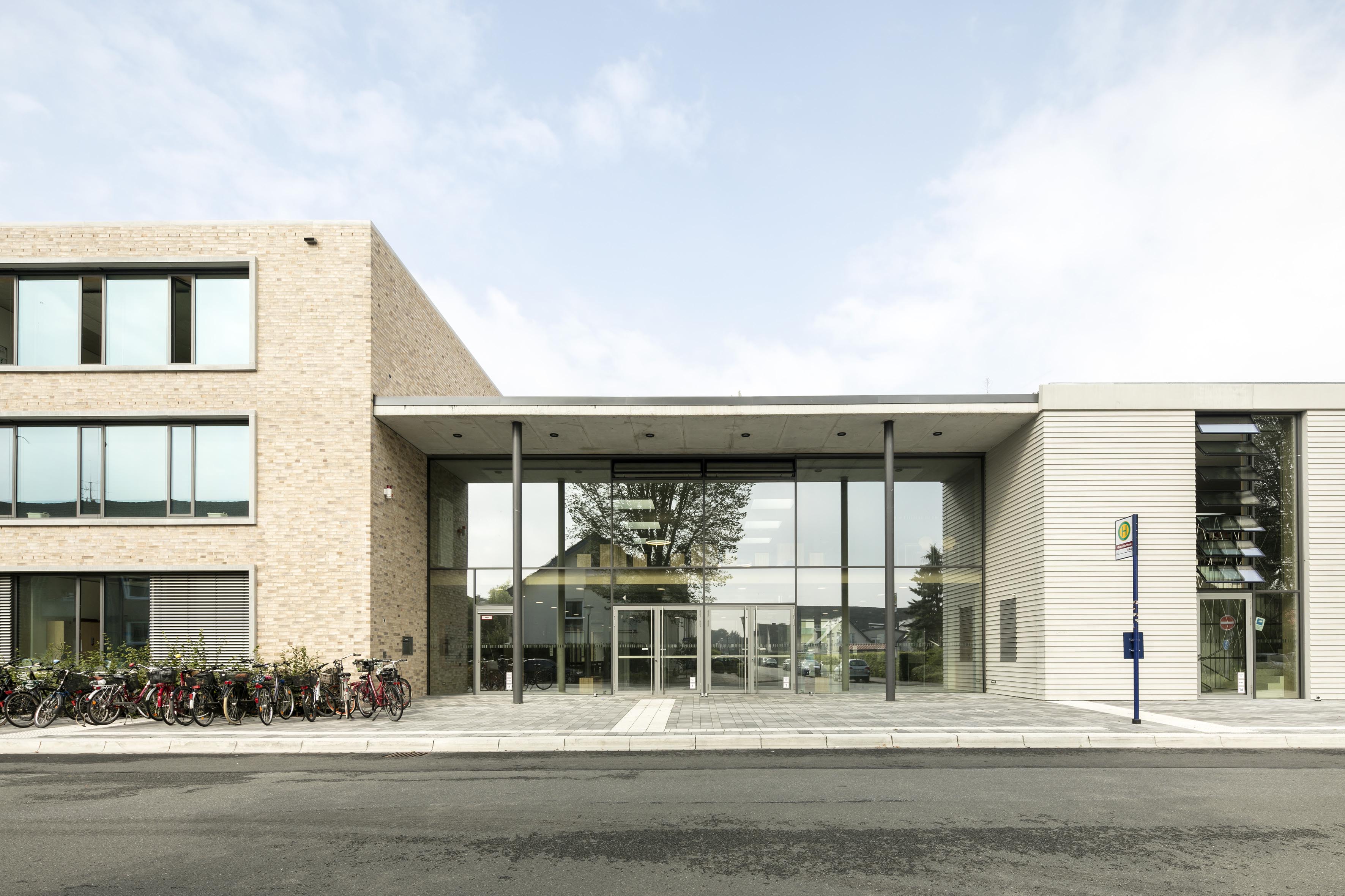 Il complesso è ampio e articolato: la scuola è composta da cinque corpi di fabbrica interconnessi che delineano un fronte omogeneo rispetto alla strada. Tutte le funzioni, comprese quelle di servizio, sono disposte intorno al luminoso atrio d‘ingresso. I singoli corpi di fabbrica sono poi differenziati dall’uso dei principali materiali da costruzione: vetro, calcestruzzo e mattoni. La particolarità del trattamento materico si estende dall'esterno verso l'interno: i cluster didattici, ad esempio, sono rivestiti in mattoni, mentre i laboratori sono in calcestruzzo facciavista con finitura in doghe a scandola.