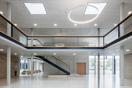 Gli aspetti legati all’efficienza energetica sono stati affidati alla prestigiosa società di ingegneria Transsolar, che ha sfruttato anche i materiali costruttivi per ottimizzare le prestazioni climatiche. Le superfici in calcestruzzo nelle aule, ad esempio, sono utilizzate in modo passivo come accumulatori a bassa temperatura, per raffrescare questi spazi in modo naturale durante l’estate, mentre copertura e pareti sono protette da strati termoisolanti di notevole spessore. Data la presenza di grandi finestre con parapetti bassi, anche lo studio dell’illuminazione mediante simulazioni digitalizzate ha inciso sulla ricerca dell’efficienza energetica: la regolazione dell’intensità dei corpi illuminanti a LED è affidata a rilevatori di movimento e regolazioni in funzione della luce diurna. I rivestimenti a soffitto sono invece realizzati con pannelli leggeri in lana di legno, che garantiscono una buona acustica nelle aule e risultano più economici del cartongesso.