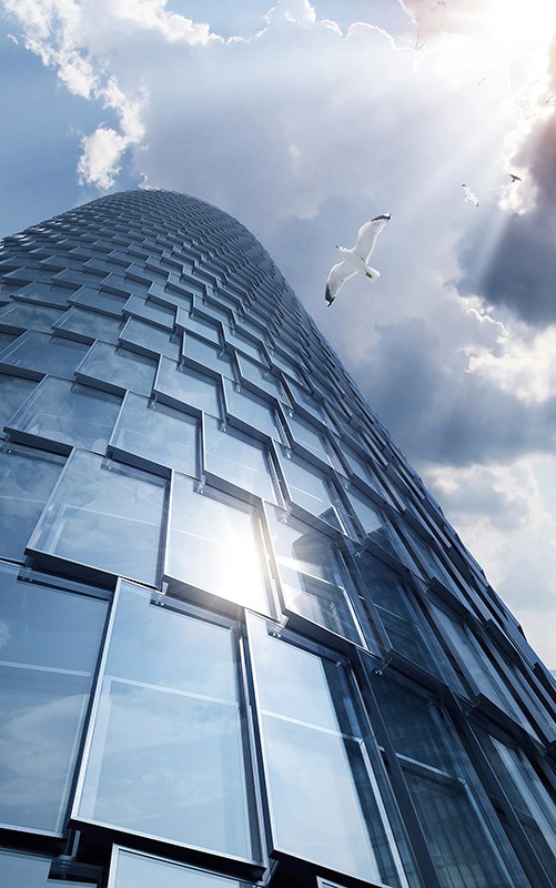 I frame vengono spostati da un livello all'altro senza corrispondenze verticali. La facciata è composta da telai in alluminio e un rivestimento esterno in vetro. Quest'ultimo fornisce l'effetto della scala con una doppia sovrapposizione orizzontale.